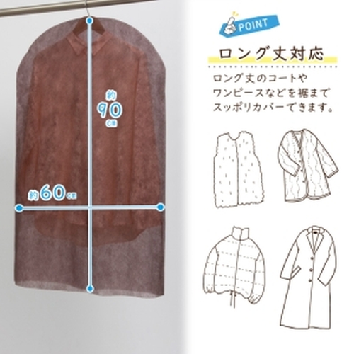 【商品仕様】サイズ/約幅60×長さ90cm、カラー/ブラウン、内容/20枚、材質/ポリプロピレン【通気性に優れた不織布製】通気性の良い不織布でオフシーズンの衣類をホコリや湿気からガード。【クローゼットがスッキリ】上から被せるだけのかんたんカバー。クローゼットの洋服がスッキリ。【洋服の毛玉や傷みを防止】カバーを掛けることで、保管中に洋服同士が擦れず毛玉や傷みを防止。【裾をハサミでカット可能】裾をお好きな位置でカットできるので、洋服の長さに合わせて使える。