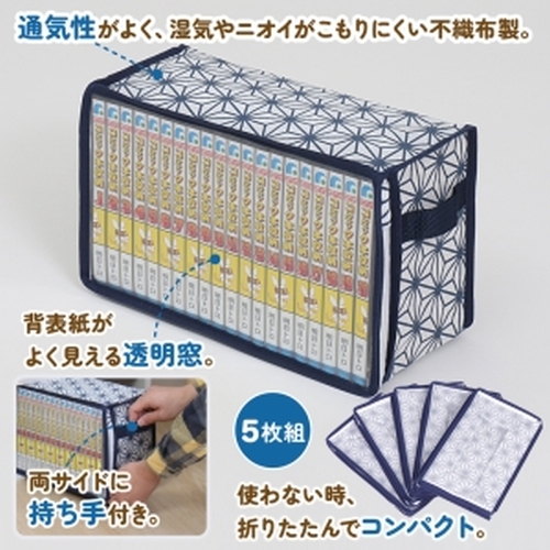 【商品仕様】サイズ/約幅30×奥行13×高さ19cm、カラー/ホワイト 麻の葉柄、内容/5個、収納目安(1ケースあたり)/コミック本:約15~20冊、適応サイズ/新書判・B6判・小B6判・B40判サイズのコミック本やマンガ本、材質/ポリプロピレン・ポリエチレン【コミック本まとめてスッキリ】漫画本や単行本などのコミックを通気性の良い不織布でまとめてスッキリ収納。ホコリなどの汚れから守る。【通気性の良い不織布製】通気性が良く厚みのある不織布を使用しており、丈夫で破れにくい。不織布は通気性がよく湿気やニオイがこもりにくい収納に適した素材です。【背表紙が見える透明窓付き】透明窓から中身の確認ができる。前面に透明窓が付いているので収納ケースを開けなくても中身が一目で分かる。【持ち手付きで持ち運びしやすい】両サイドに持ち手がついており、本棚やクローゼットなどの収納場所から取り出しやすく、持ち運びもしやすい。