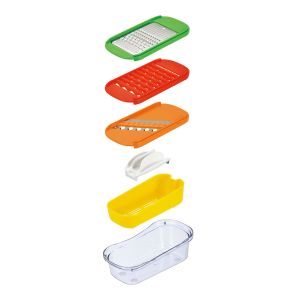 本体:ポリプロピレン(耐熱温度110度)、刃:ステンレス鋼、容器:AS樹脂(耐熱温度100度)・ザル:ポリプロピレン(耐熱温度110度)サイズ約100×75×290mm(234g)箱サイズ約150×80×340mm